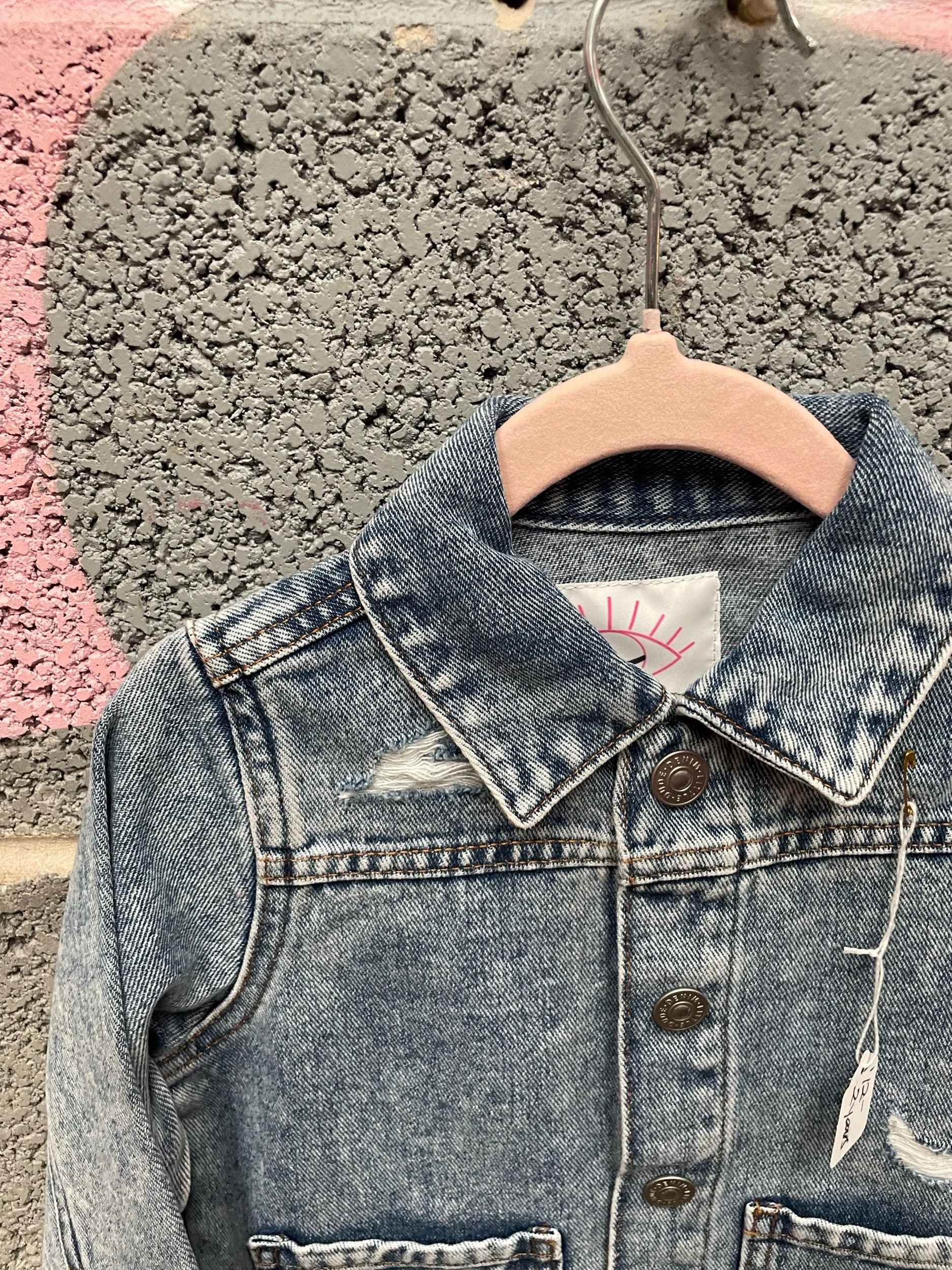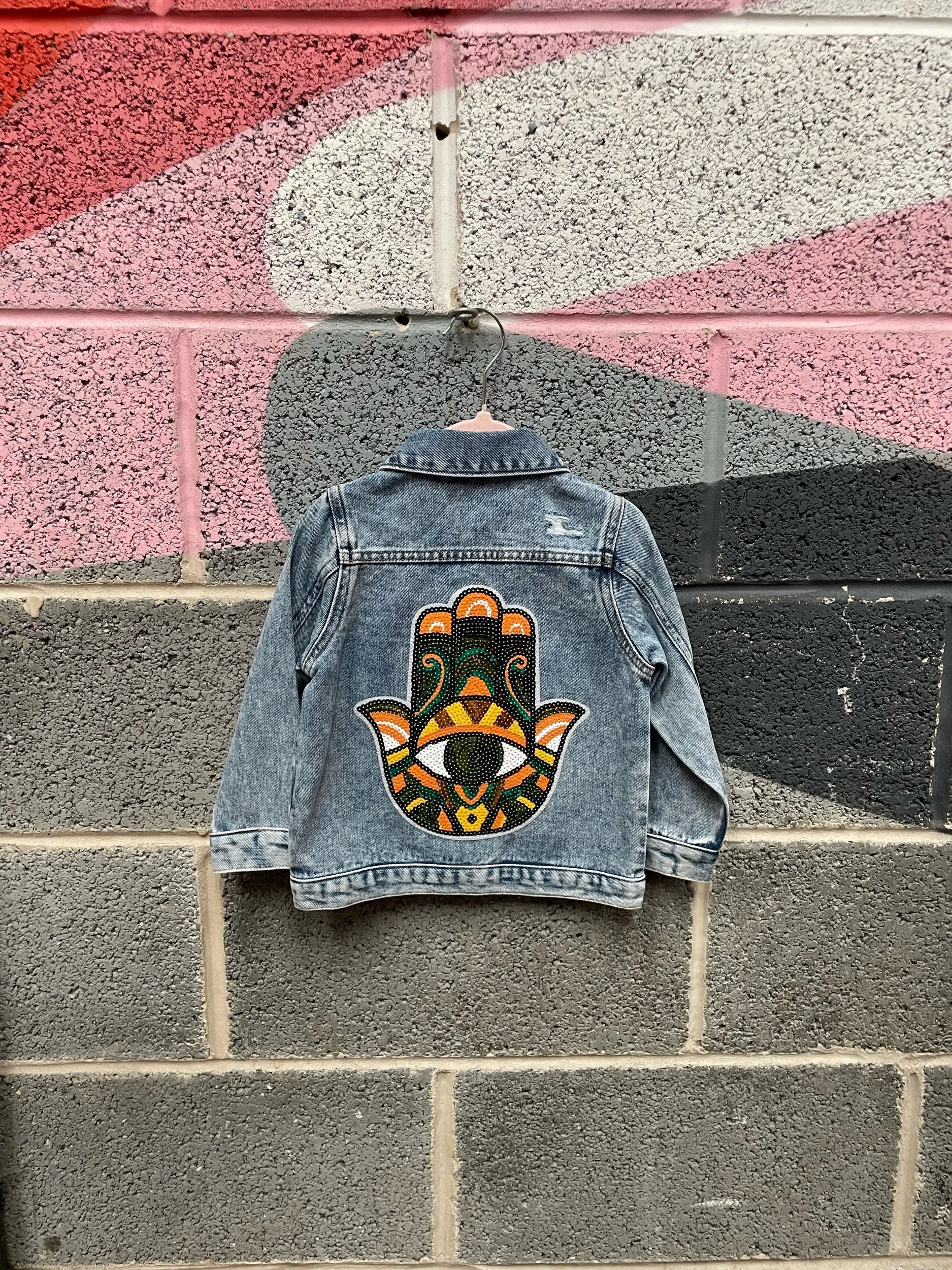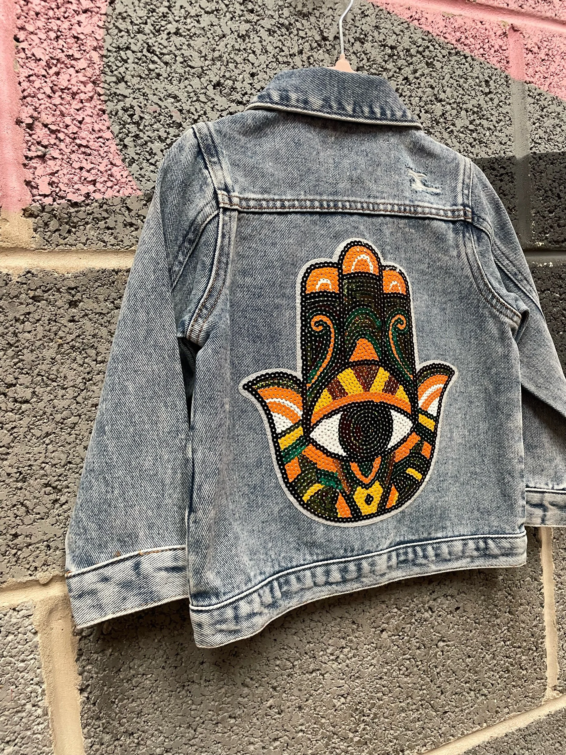 Super soft stretch denim, grey washed jacket with two hip pockets, distressed detailing and front button fastening. Embroidered back with gorgeous yellow hamsa patch.