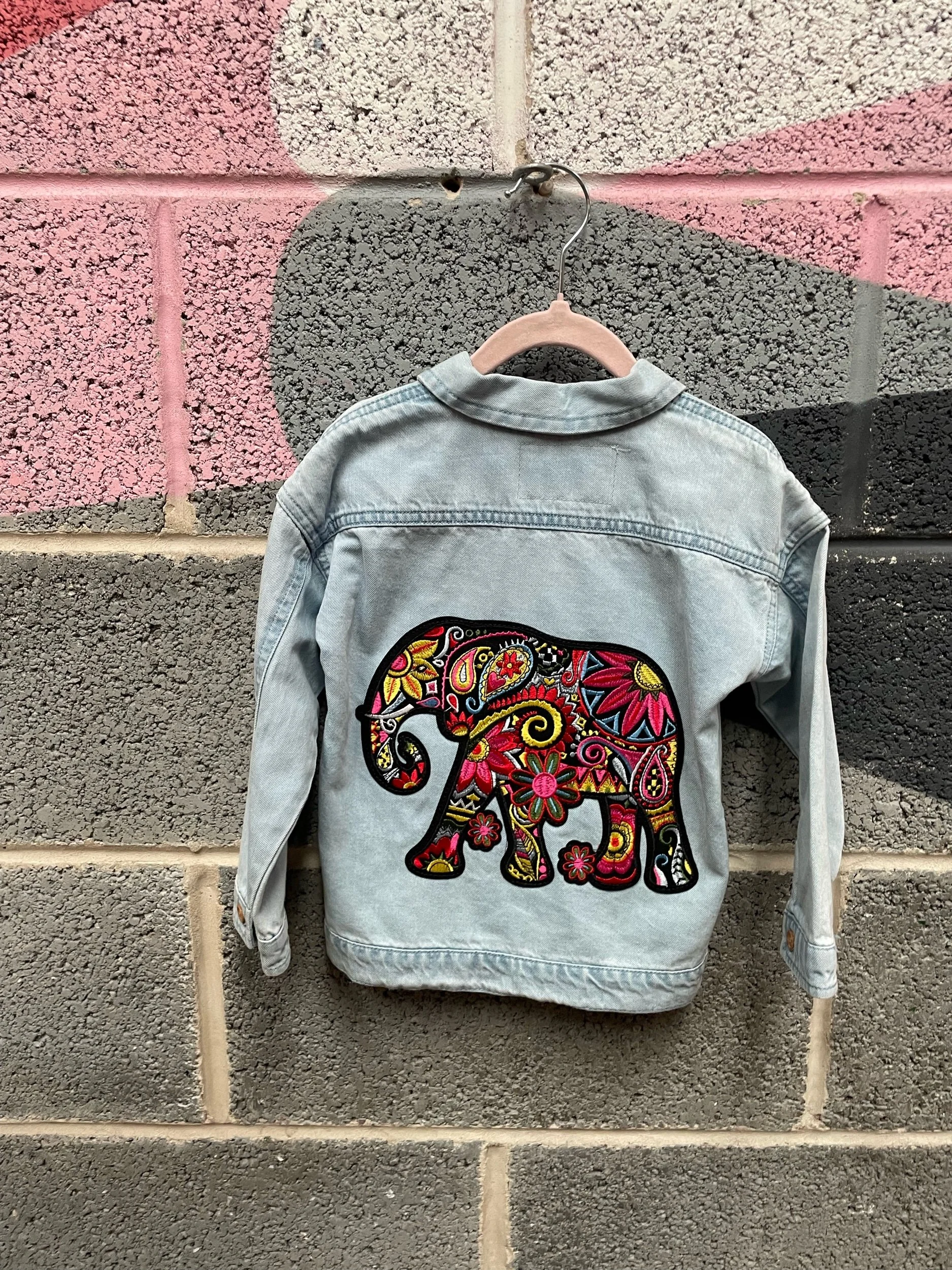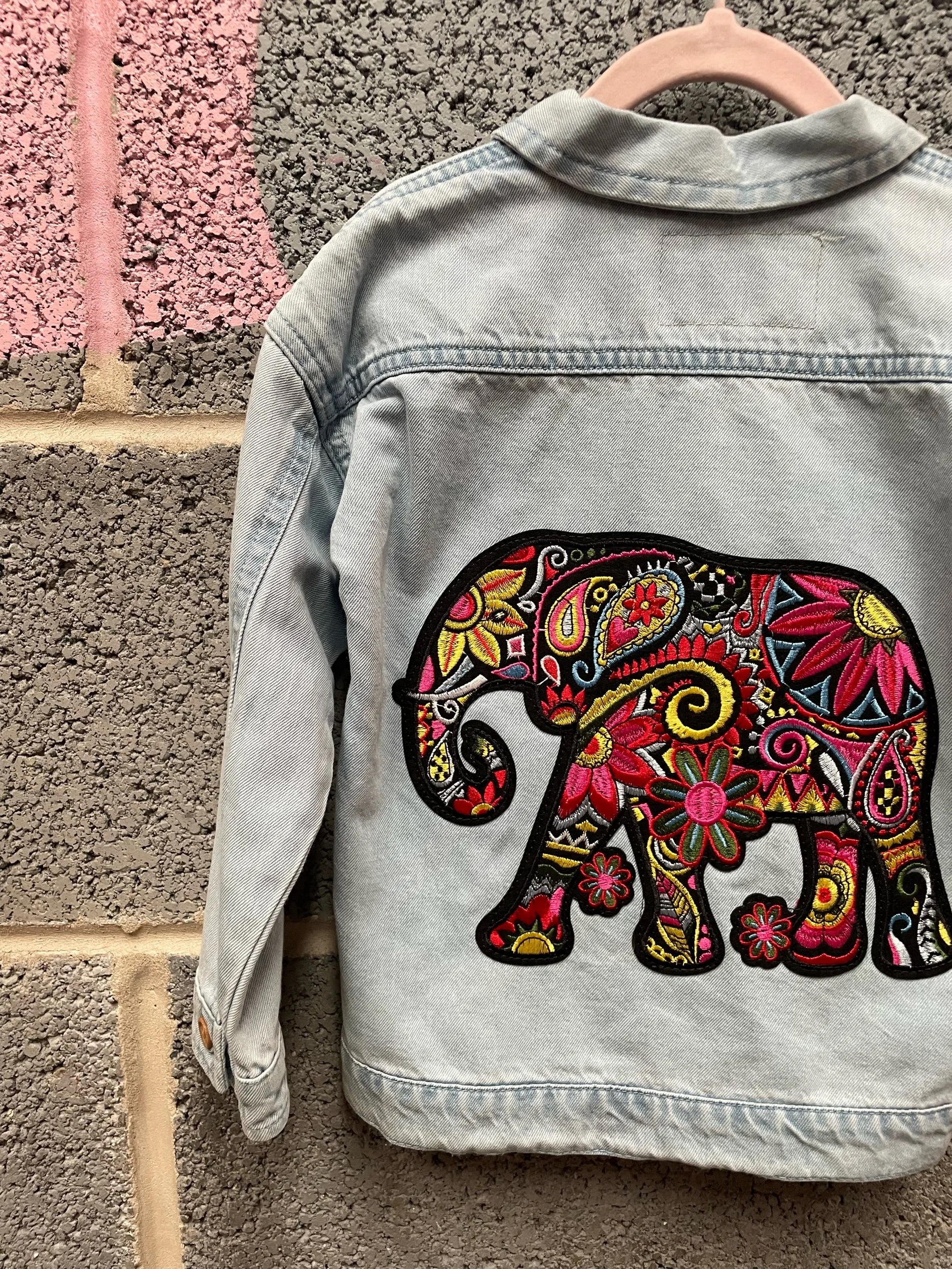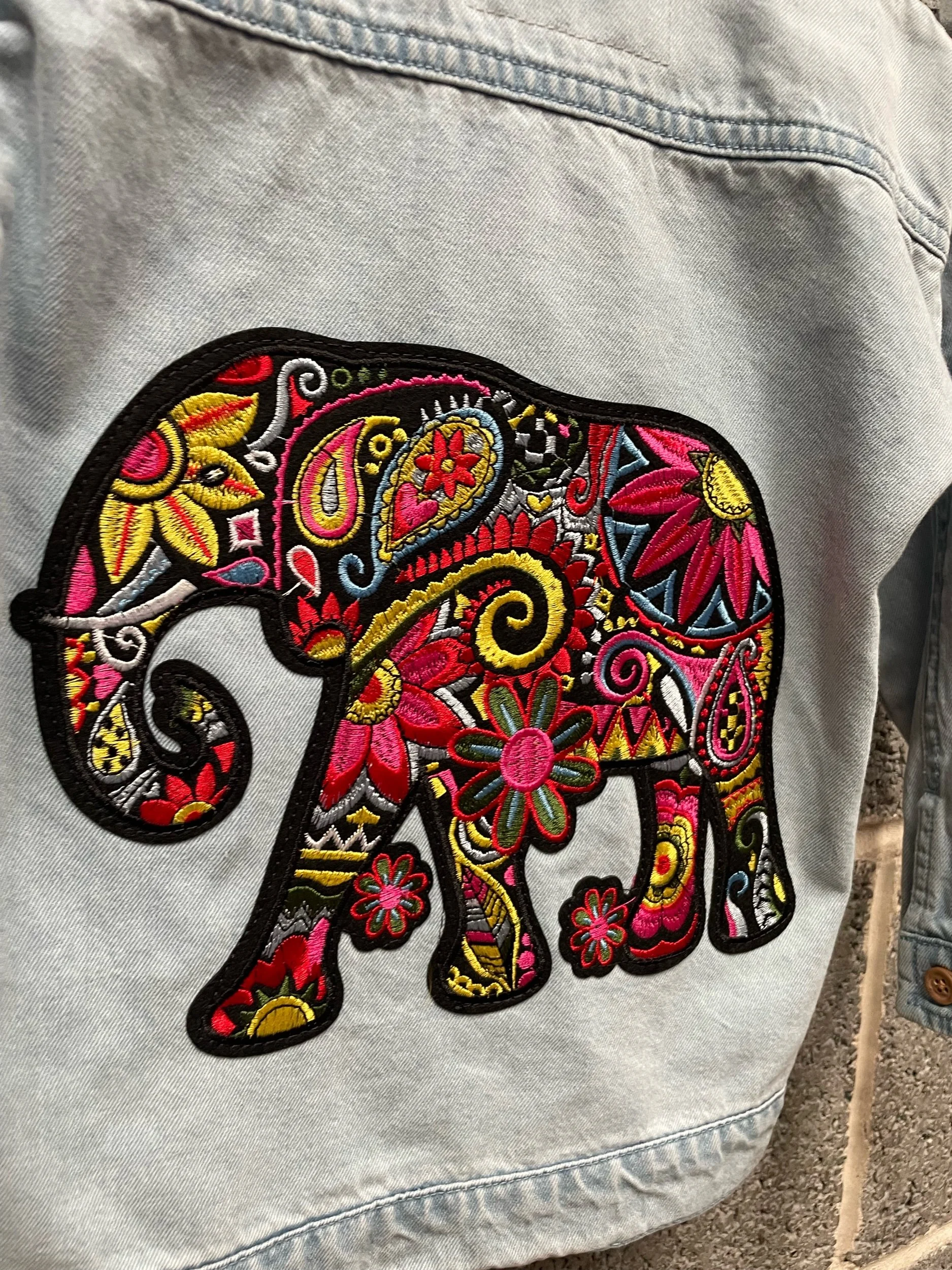 Super soft stretch denim, light washed jacket with two hip pockets, one chest pocket and front button fastening. Embroidered back with beautiful Indian elephant patch.