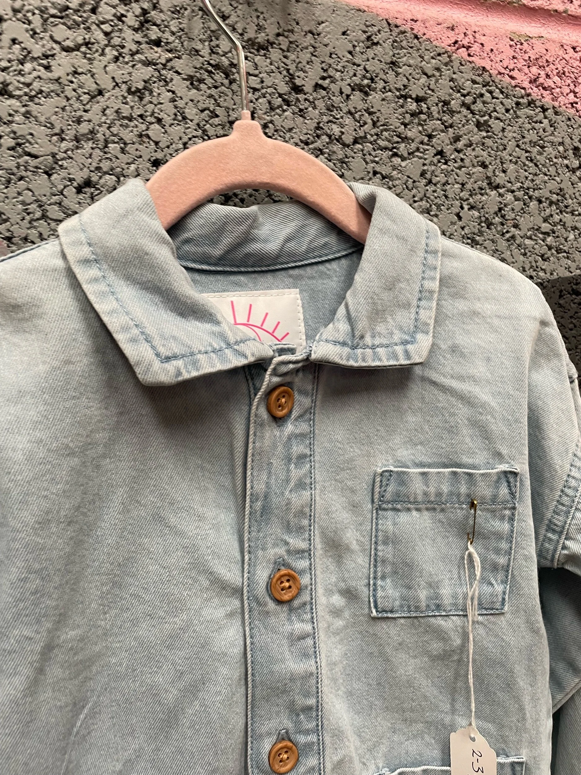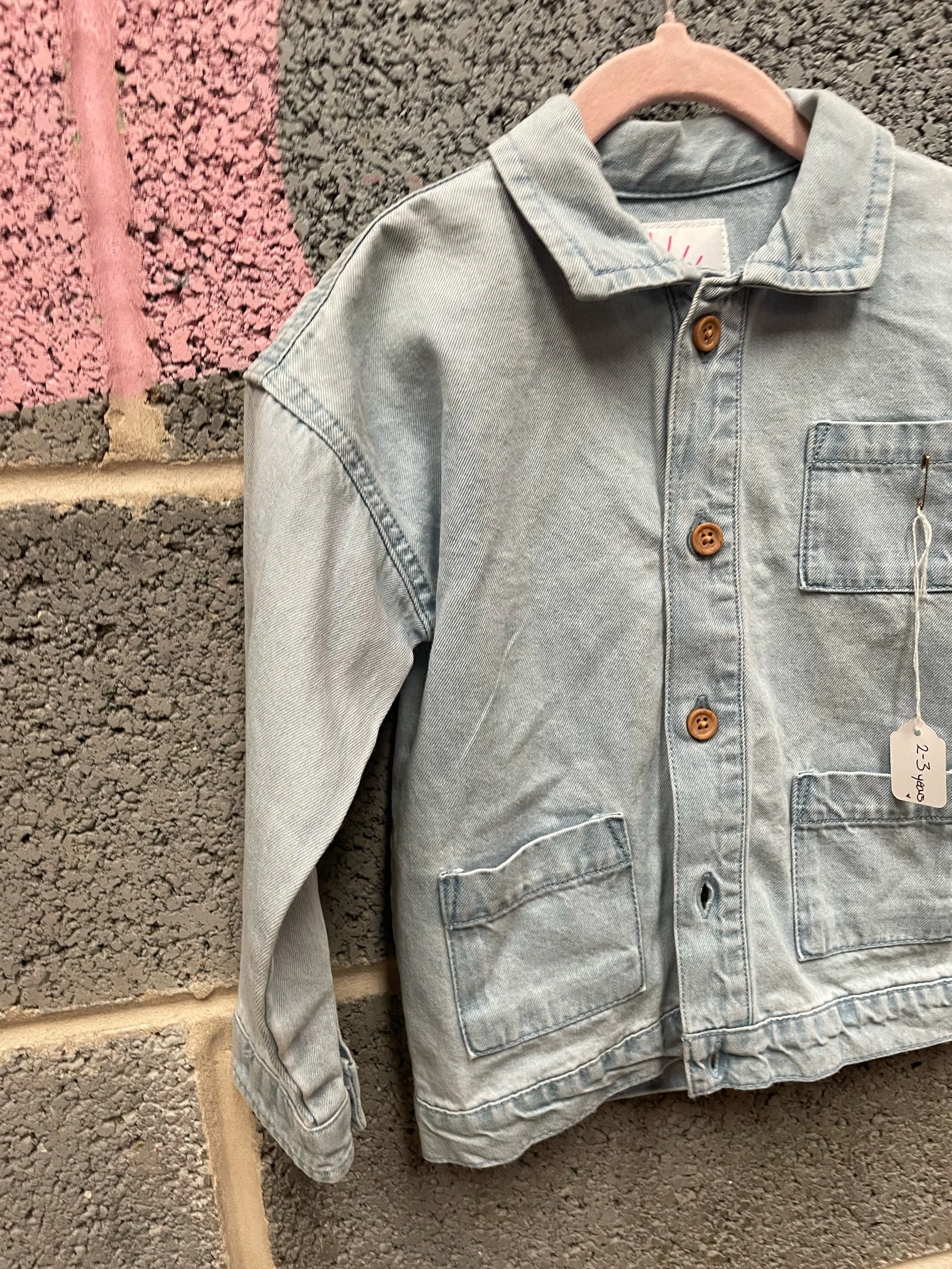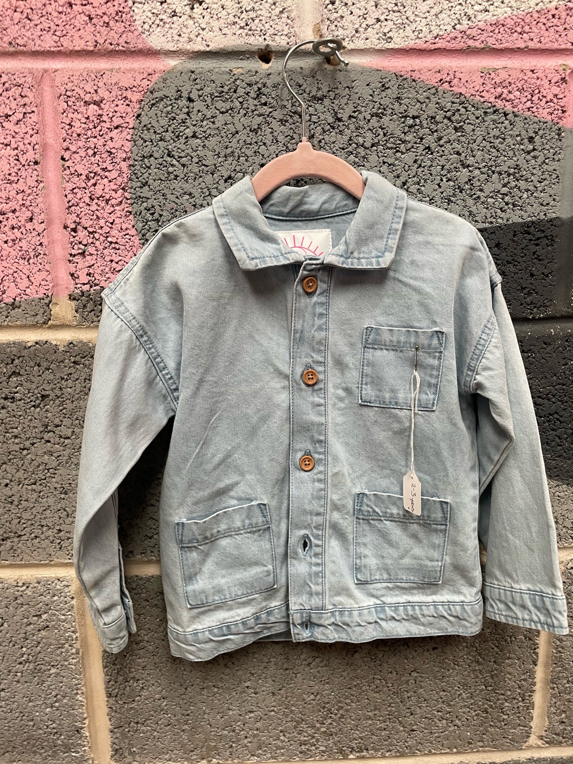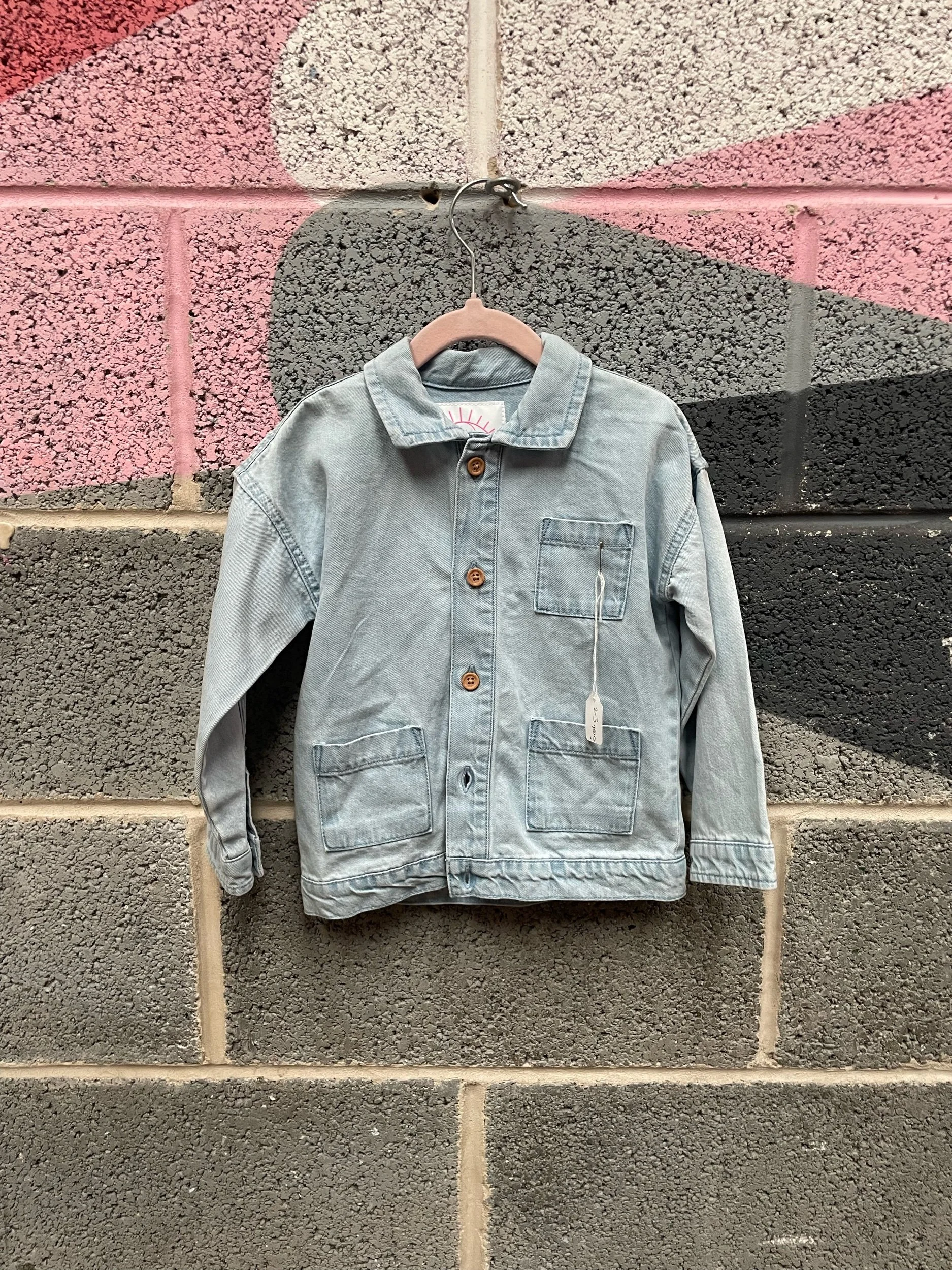 Super soft stretch denim, light washed jacket with two hip pockets, one chest pocket and front button fastening. Embroidered back with beautiful Indian elephant patch.